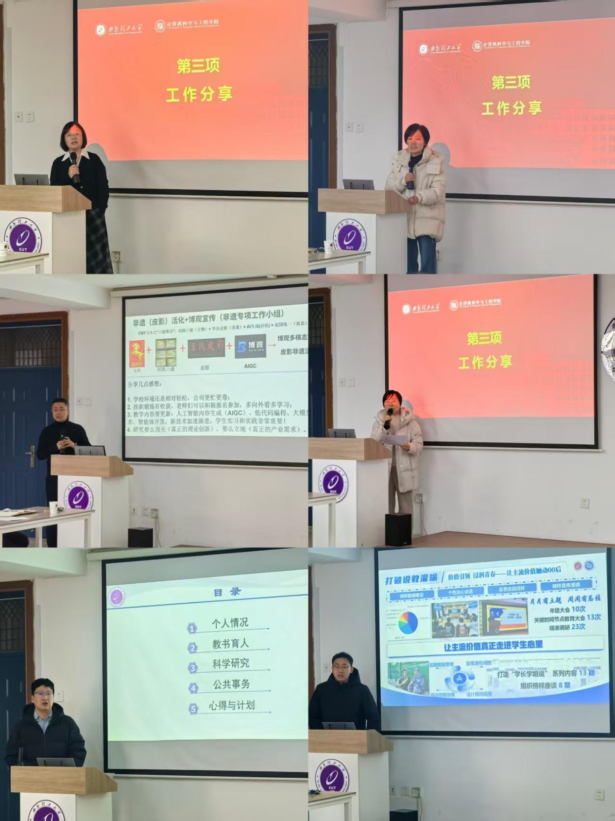 六位来自不同岗位的优秀教师依次登台,分享他们的实践感悟:拥有37年教龄的张亚玲教授强调教学内容必须与时俱进,始终以学生为中心,让课堂真正“活”起来;“双肩挑”干部赵明华结合自身经历,讲述了如何在教学、科研与管理多重角色中实现相互促进,并鼓励青年教师积极参与公共事务,“在服务集体中成就自我”;叶青老师作为系主任,聚焦人才培养全过程,从课程优化到就业指导,详细分享了提升学生综合素质的实践经验;肖照林教授结合在陕文投集团挂职的经历,提出科研应“顶天立地”——既瞄准前沿,也回应产业需求,并鼓励青年教师走进企业,让真实场景反哺教学;李宇昕作为青年教师代表,真诚分享入职以来的教学科研心得,表示要善用学校、学院的政策支持,主动向资深教师请教,方能稳步成长;辅导员王任涛用一个个温暖故事,诠释了与学生共同成长的育人情怀。